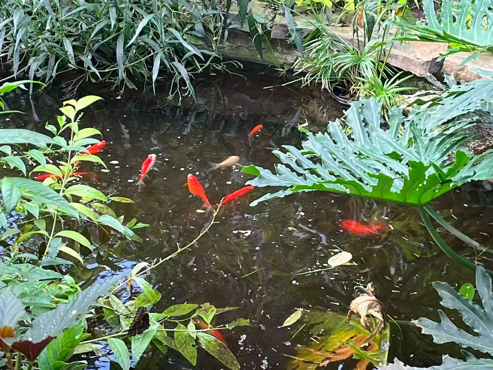 整个温室公园规模不算太大,但里面建有小桥流水,假山飞瀑,多种热带植物繁茂苍翠,错落有致。美丽的小鸟啾啾鸣叫,不时在穹顶下振翅飞翔,蜿蜒曲折的小径环绕着一个人工小池塘,一群金色的鲤鱼在清澈的水中自由自在的游玩,整个公园颇具中国园林的神韵。